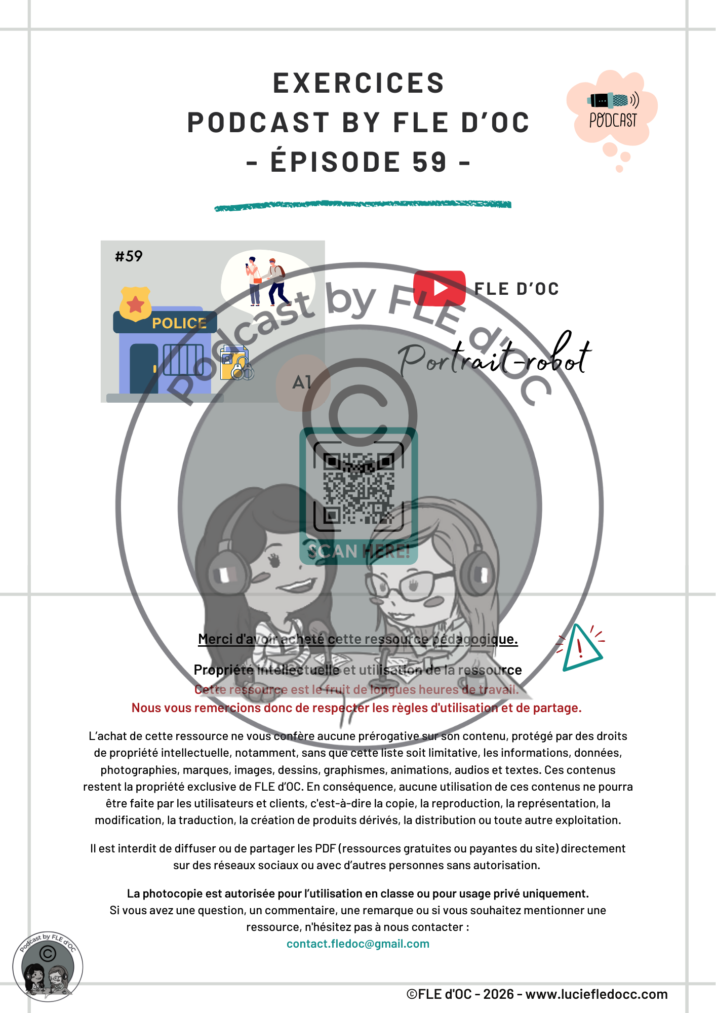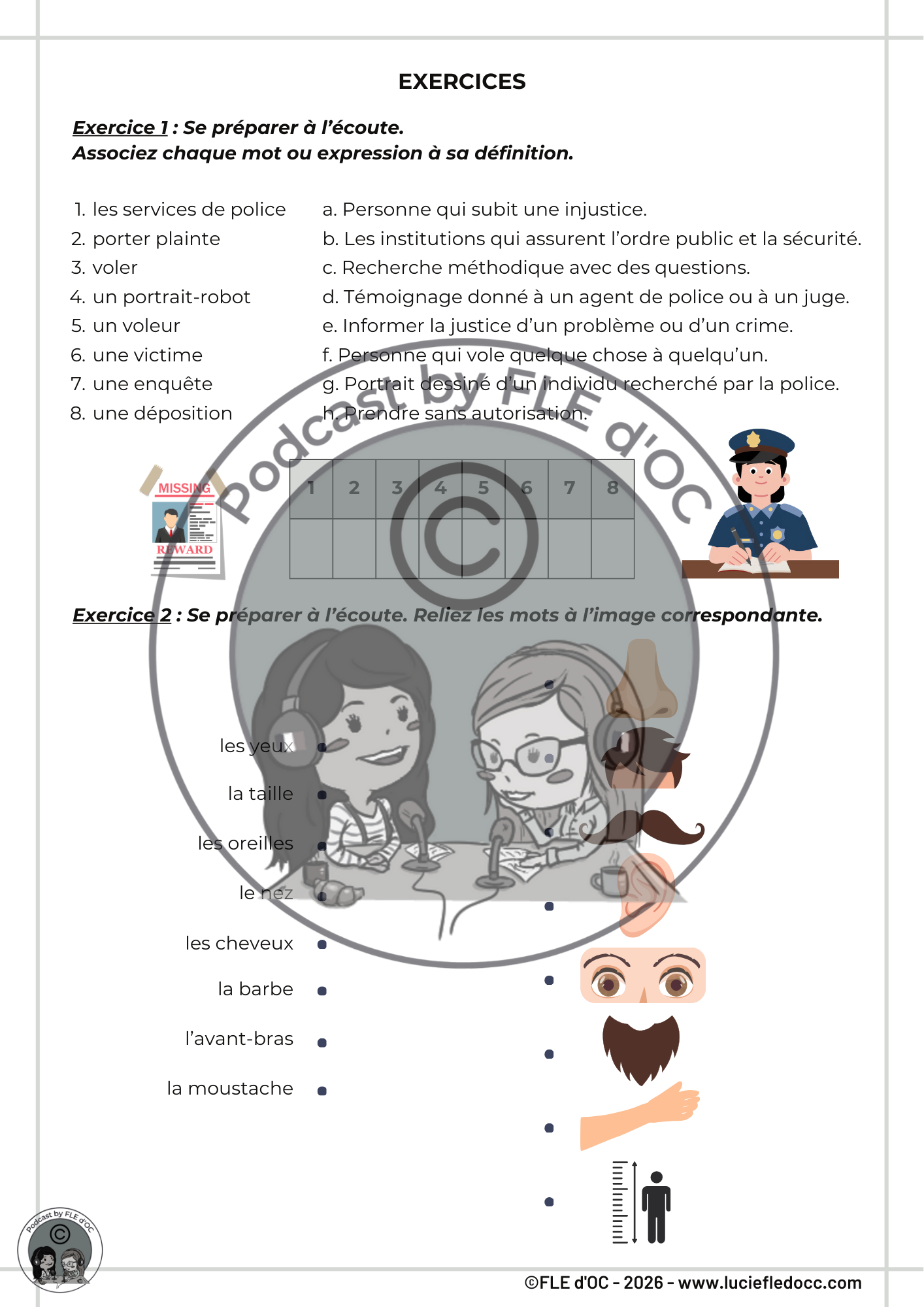 Ce document contient 3 exercices pour aider à la compréhension de l’épisode #59, Portrait-robot (A1) de Podcast by FLE d’OC. Les corrigés et l’audio sont inclus.