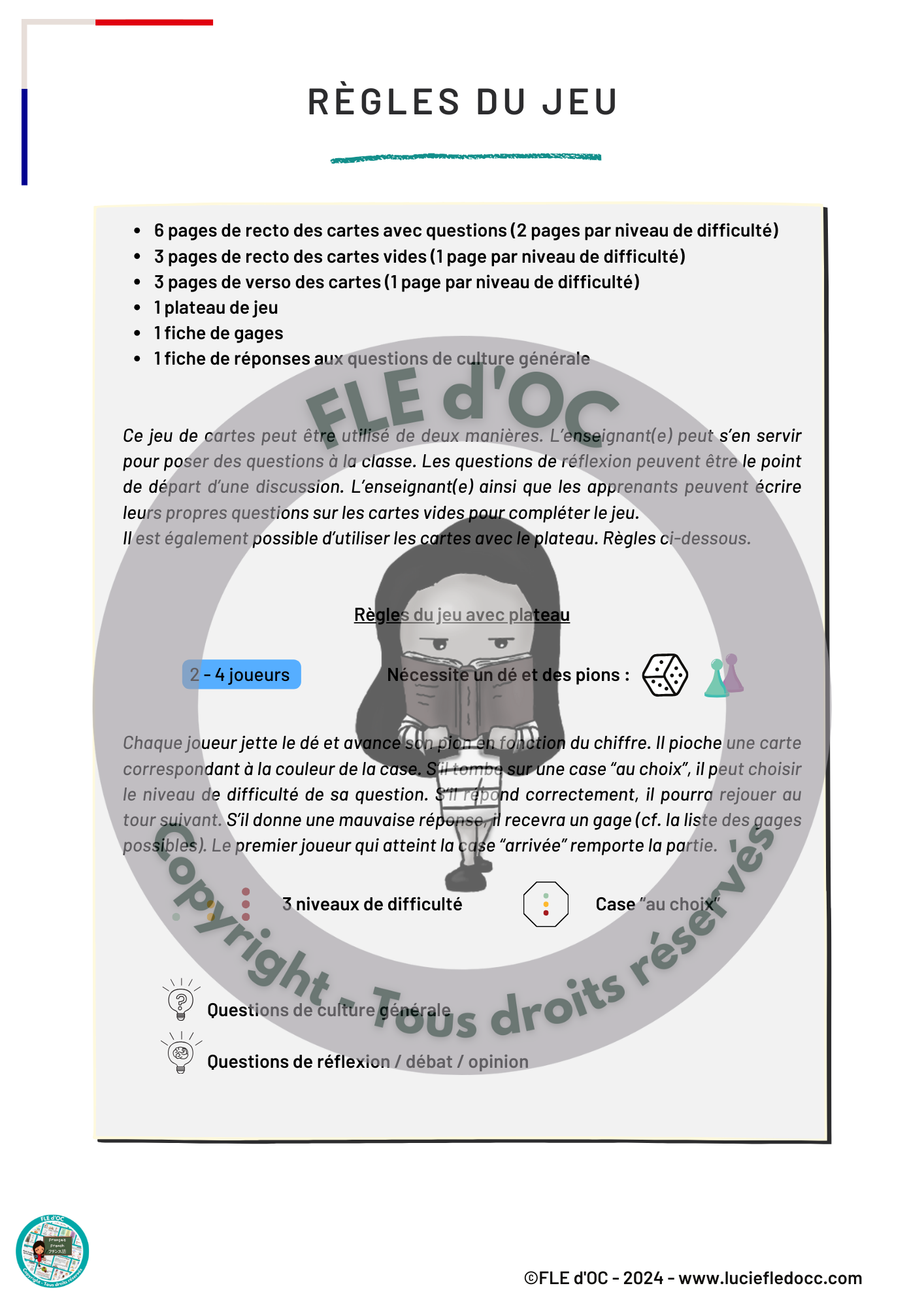 Il peut être utilisé en classe par des enseignants afin d’encourager la communication en français entre les étudiants. Il comporte 54 cartes et un plateau de jeu à imprimer, découper et plastifier. Ces cartes contiennent des questions de culture générale, de réflexion, de débat et d’opinion.