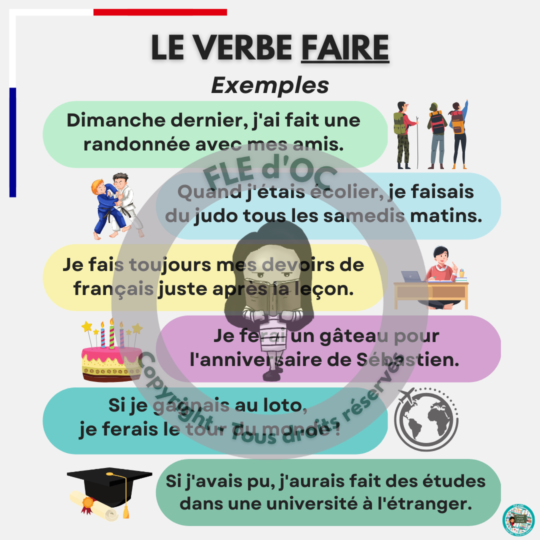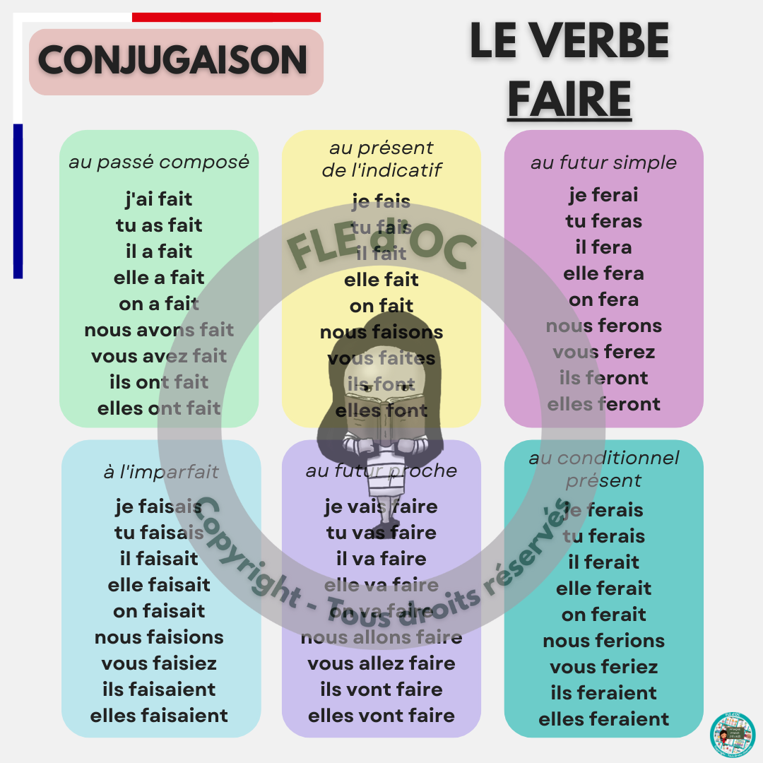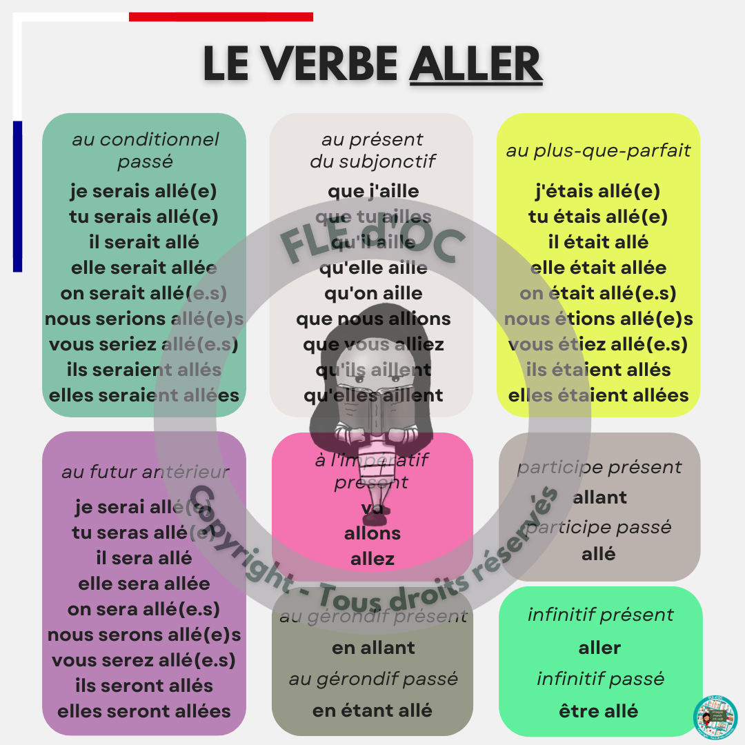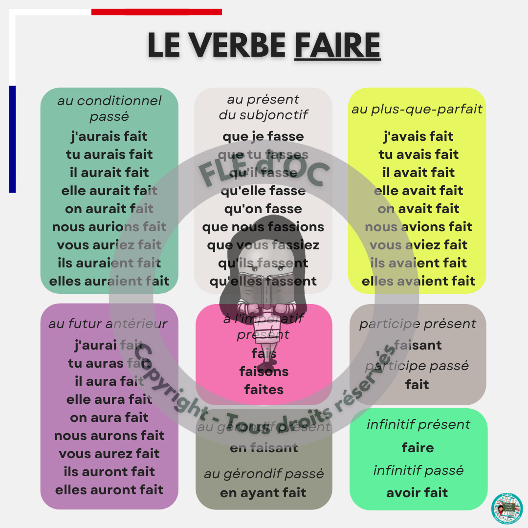 Chaque verbe est conjugué aux temps et modes suivants : passé composé, présent de l’indicatif, futur simple, imparfait, futur proche, conditionnel présent, conditionnel passé, présent du subjonctif, plus-que-parfait, futur antérieur, impératif présent, participe présent, participe passé, gérondif présent, gérondif passé, infinitif présent, infinitif passé.