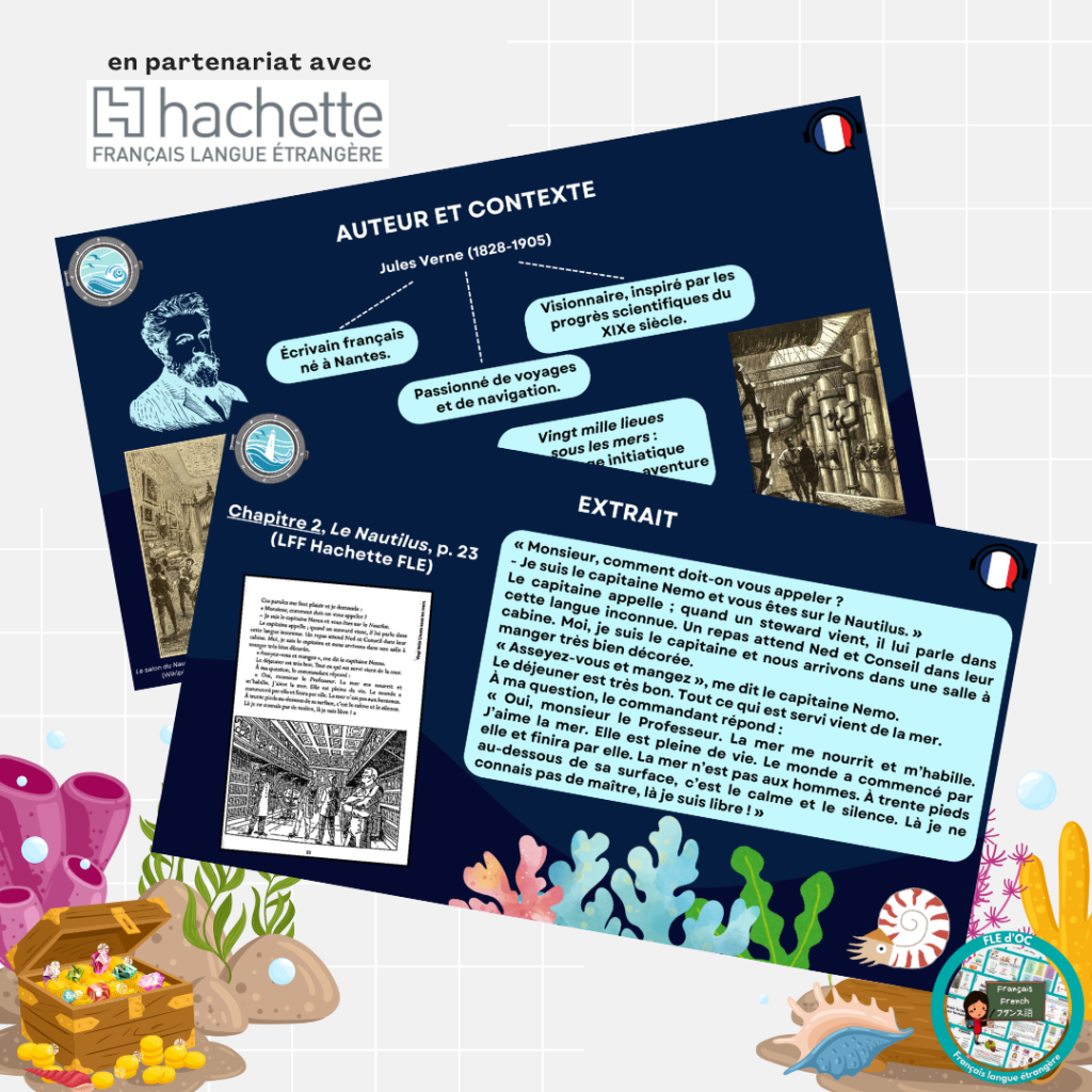 🔎 Cliquez sur ce lien pour jeter un coup d’œil à la version de Vingt mille lieues sous les mers proposée par Hachette FLE : https://www.hachettefle.com/livre/lff-vingt-mille-lieues-sous-les-mers-b1-9782011559760/